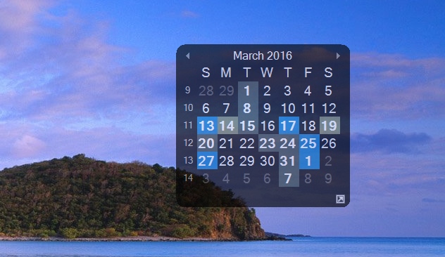 The Desktop Calendar can be resized by clicking the "Move/Resize" button at the top of the window. This will result in a border appearing, which can be dragged to resize like a typical window. Areas of the Desktop Calendar can be pinned or undocked, which combined with the resizing capability, results in many potential layouts of the desktop calendar. For example, if you only want to see the Navigation Pane and Upcoming Events, the Tasks pane can be unpinned (click the pin button next to the "Tasks" label). Next, click the "Move/Resize" button and adjust the Desktop Calendar width so the Day/Week/Month tabs in the middle are hidden. Here's how it would look: