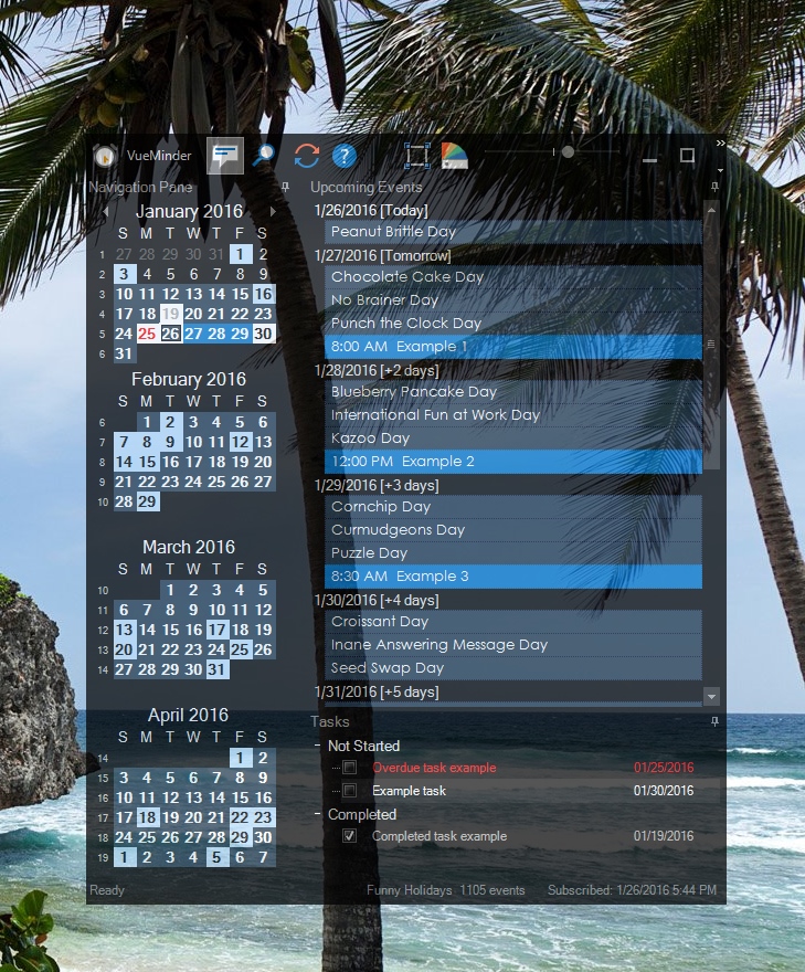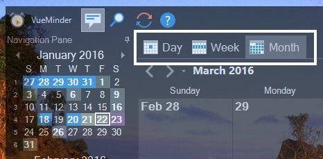 VueMinder integrates a Desktop Calendar into the Windows desktop. This is an interactive, simplified version of the Main Window, providing Day, Week, and Month views.